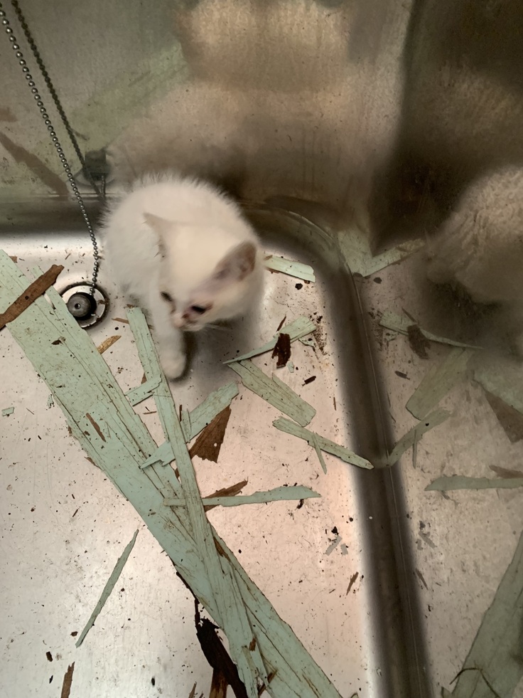 きょうだいの白い仔猫もお風呂のシンクの中でいたので保護してしました。