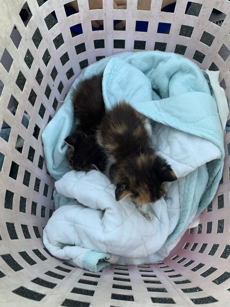 1匹家の前にポツンといたみたいで現場に行くとまさかの低体温できょうだいらしきミケの仔猫も💦2匹とも授乳が必要。
