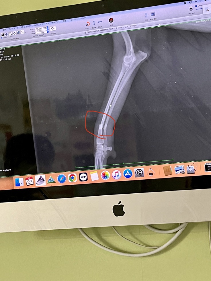 自宅に帰ってから低めのソファからジャンプをした際に、骨が弱っているため、左前足を骨折してしまい手術が必要となりました。