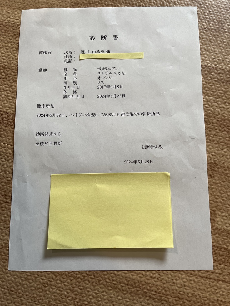 しかし、我慢強いチャチャは痛がって何度も鳴くこともなかった為、まさか折れてるとは思いませんでした。病院に連れて行くと、2本の骨が折れており、プレートを入れる手術が必要となりました。また、骨折の際にぶつけてしまったようで、弱っていた歯も折れてぐらついてます。おそらく全ての歯を抜くことになるだろうと言われてますが、歯の治療と不妊治療は、別で行う予定です。