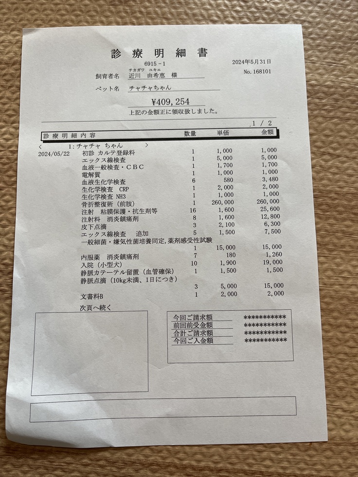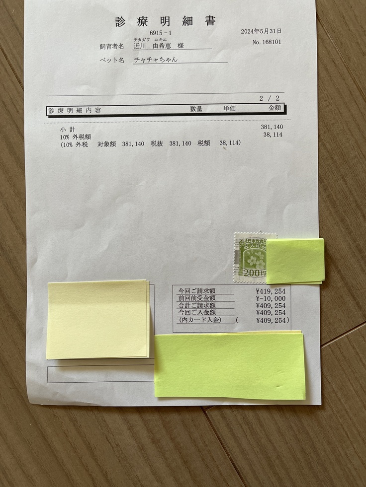 - 必要金額と目標金額の差額は、自己負担いたします。 診療明細419,254円(内金10,000円を含む) 保険適用150,000円 差額269,254円をクラウドファンディングで集めます。 足りない分や、完治までの今後の通院費は実費負担いたします。