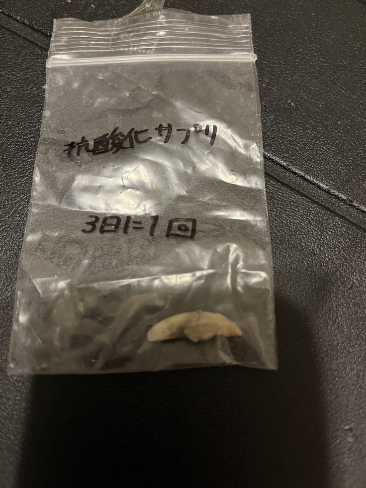 骨折治療の入院中に抜けたので、薬の名前が書いてあります。こんなに太い犬歯が抜けるって骨がすごく弱っていたんだな。。と思いました。