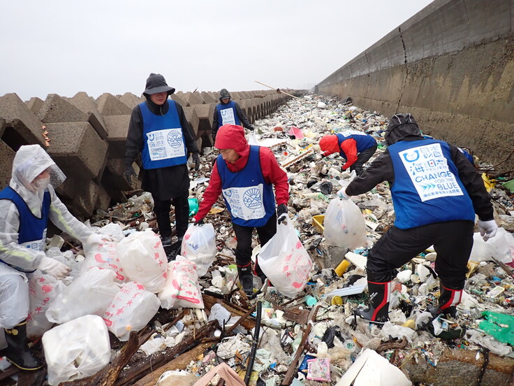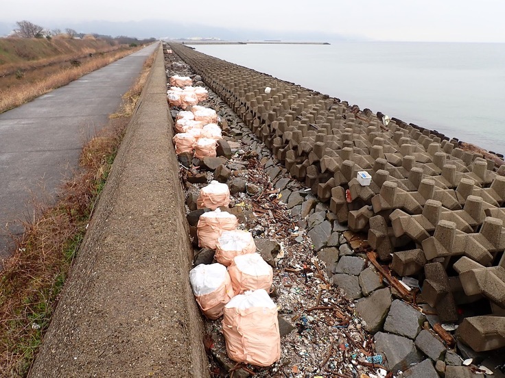 堤防と消波ブロックに挟まれているため、台風や季節風に乗ってブロックを超え漂着した大量の海ごみが海に戻らずに溜まっていきます。