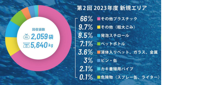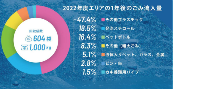 2023年は全長2キロメートルのうちの400メートルの区間で、2月12日~26日の延べ10日間ごみ拾いを実施。その結果、拾ったごみの総重量8,500キログラムにもなりました。さらに、回収したごみを8種類に分け集計し、どのようなごみが多いかも調べました。