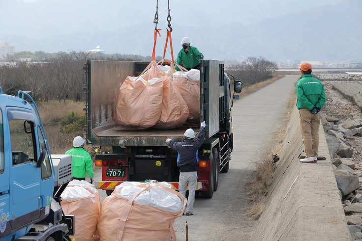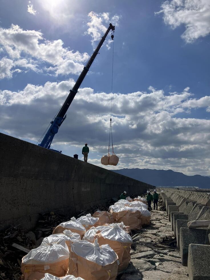 トン袋の中身は海ごみなんですが、僕たちと応援してくれる人たちの想いも詰まってるように思えて、クレーンで運び出されるトン袋を
