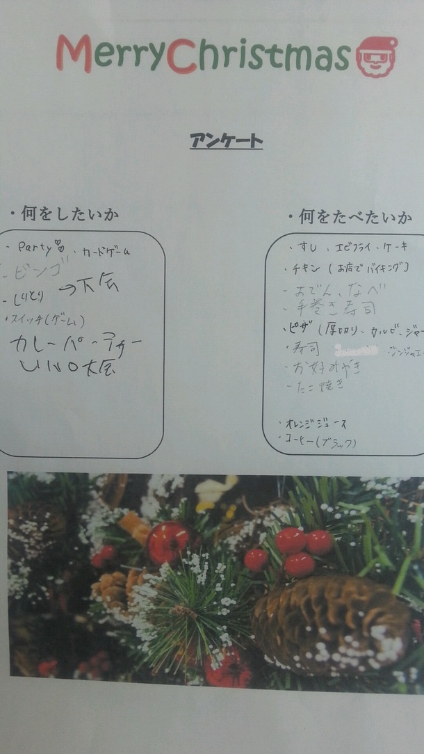 只今、利用者様に「クリスマス会」で何をしたいか?何が食べたいか?のアンケートをとっています。