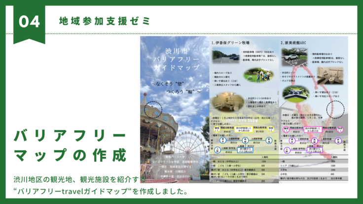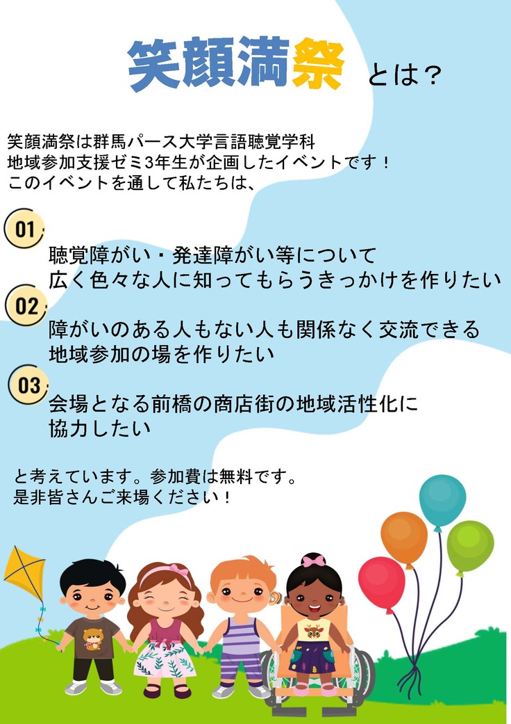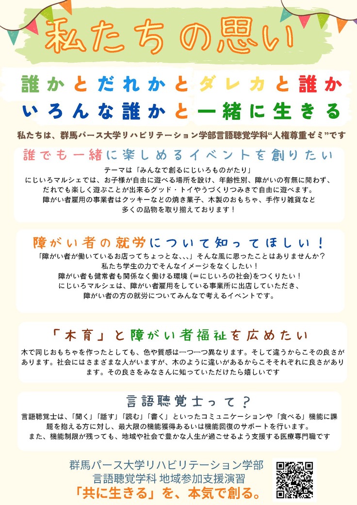 設備的には先進国並みの日本のリハビリテーションが実際、遅れをとっているのは、一般の人々の、障がいのある方に対する無理解や誤解、偏見や不安、そして不寛容が、障がいのある方に困難や苦痛をもたらしてしまっているからなのです。障がいのある方に対する社会側のこうした意識を変えて、障がい者はもちろん、高齢者、子ども、女性、全ての人が公平に、安心してその人らしく生きることのできる「共生の社会」を実現するのが、群馬パース大学言語聴覚学科の理念です。この授業は、その理念を実現できる言語聴覚士を育成するための最も大切で象徴的な科目です。学生は、一年をかけて、自分達で社会の課題を見つけ、その解決のためのプログラムを考え、地域の一般の方と連携して、実際に具体的な事業として実践します。