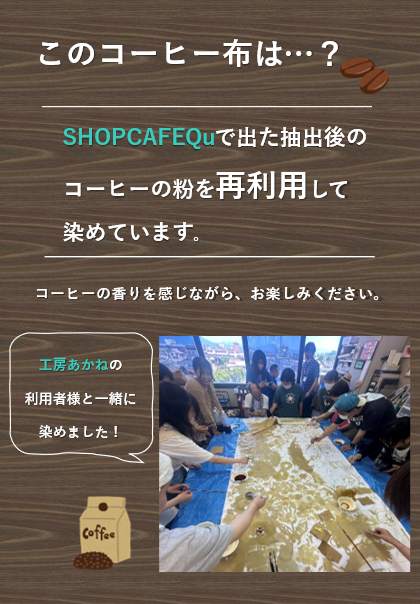 ▼ベースとなるコーヒー染色は、SHOP CAFE Qu の使用済みコーヒー粉を利用しています。そこに、工房「あかね」の皆さんと学生達がコーヒ液で下絵を染め、当日は道の駅まえばし赤城に来られた方々、SNSで知って駆けつけてくださった方々、そして、工房「あかね」の方々と学生達とが大人も子供も身体をくっつけあって、想いを重ね描き完成しました。世界にたったひとつの素晴らしいアート作品です。完成品は、7月より道の駅まえばし赤城のSHOP CAFE Qu店内に展示予定です。是非、見にいらしてください。
