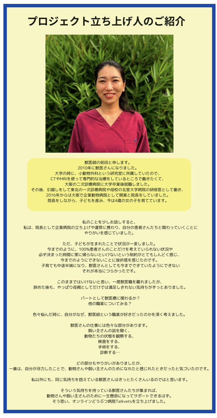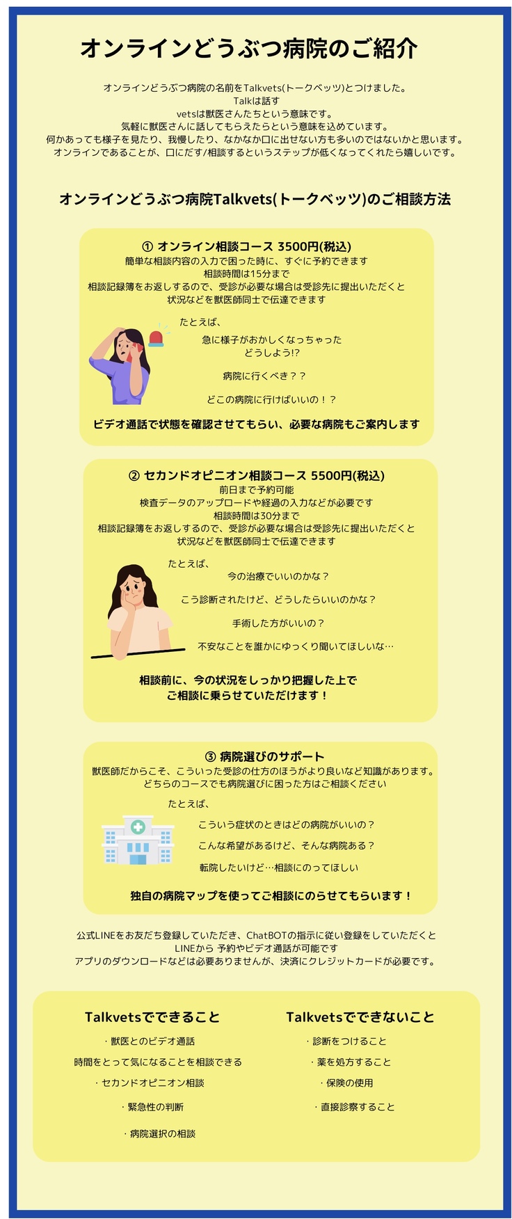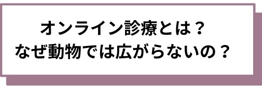 そこで、その解決方法の一つにオンラインという手段を獣医という立場で提案したいと考えています。