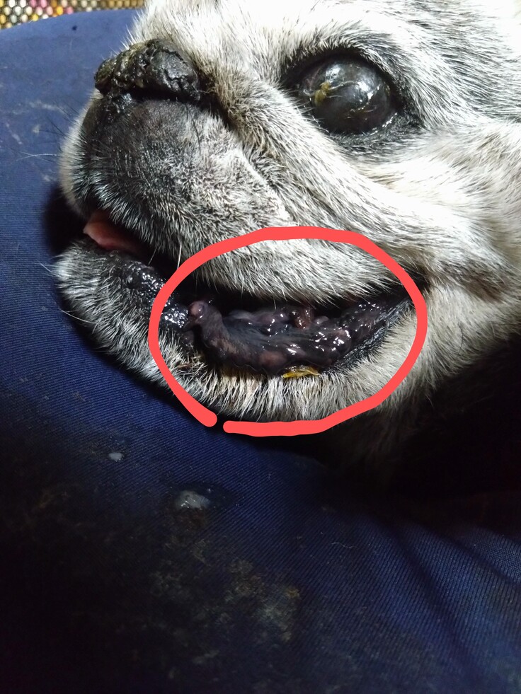 パグのジョー(15歳)が悪性黒色腫(ステージ4)を発症し、進行のとても早いガンで既に肺に転移している状態で、手術はもう出来ない状態だと言われました。数年前から後両足が弱り現在は自力での歩行はできません、膀胱炎や急性肝炎など入退院を繰り返しようやく最近では体調が少し安定してきたかなと思った矢先に、御飯が左側の口からよくこぼれるようになってなにげに顎の下を触ると少し腫れているのに気づき、すぐに病院で診察してもらいましたが、詳しい検査をしないと分からないとのことで、腫瘍専門がある病院を紹介してもらい、造影剤を使用したCT検査、組織検査の結果、口腔悪性黒色と診断され腫瘍の大きさや肺に迄転移していることから手術は出来ないとのことで放射線治療しか有効な治療はないと言われました。ガンの進行が早く、何も治療をしないと口腔が壊死していく可能性があると説明され、根治は困難ですが、せめて最後迄御飯を食べてもらいたいと思い、放射線治療をしてあげたいと思いました。しかし、高額の検査費と治療費の為、放射線治療するのはかなり困難と半ば諦めていた時に、この活動を知り、せめてもう少しでもジョーとの時間を過ごせるように、皆様のご支援よろしくお願いいたします。
