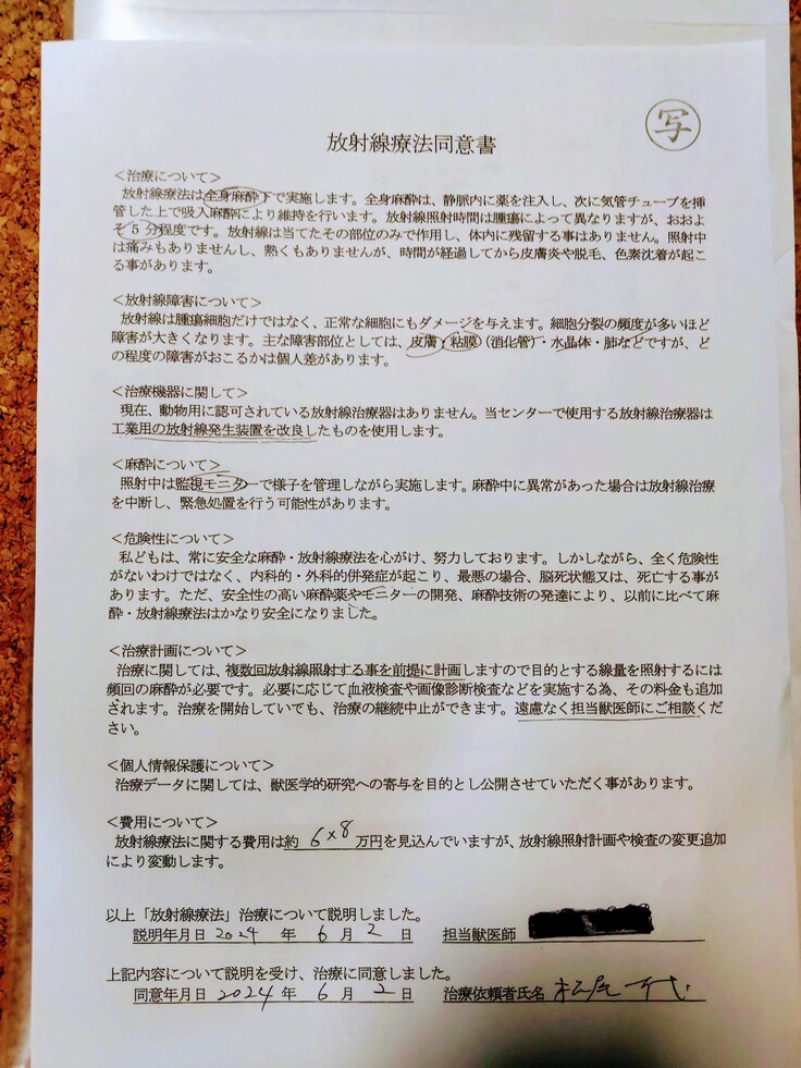 放射線治療でも根治はかなり困難かと思いますが、このまま治療をしなければ口腔が壊死してしまうので、せめて大好きな御飯だけは最期まで食べさせてあげたい思いしかありません。