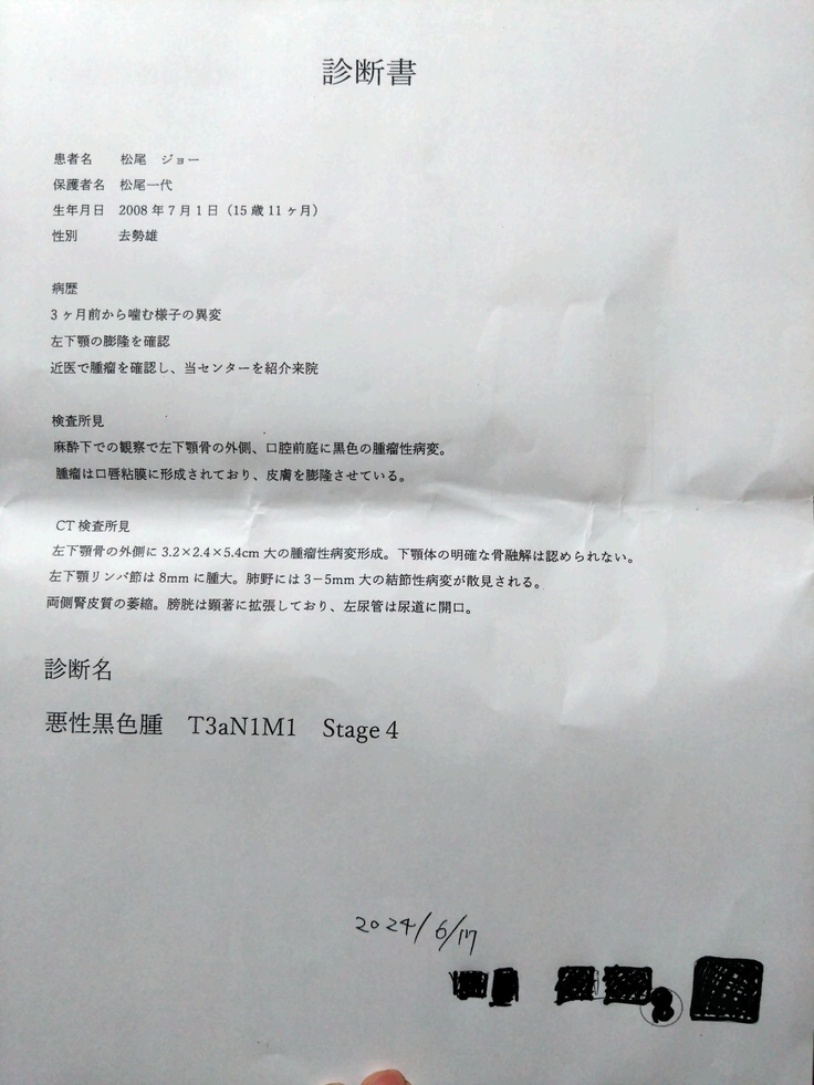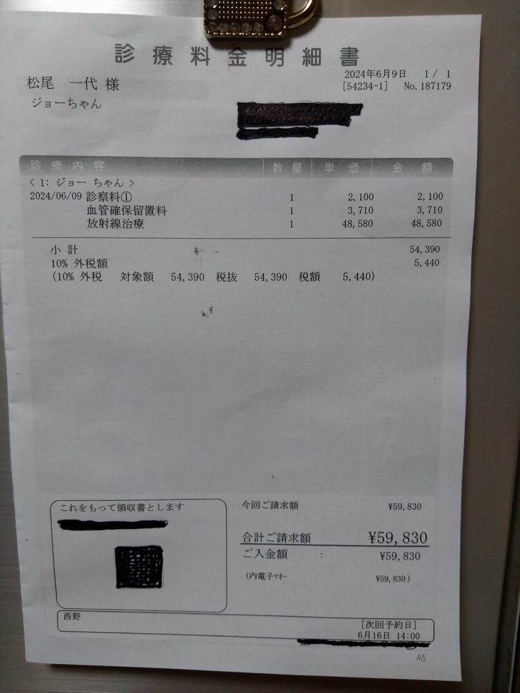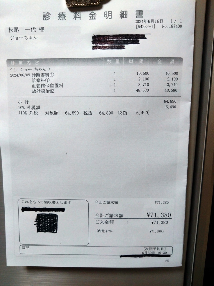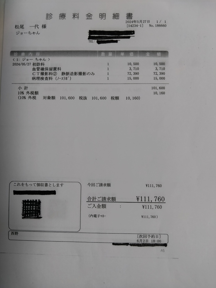 悪性黒色腫のジョーがCT(造影剤)での検査(検査済)¥111,760と放射線治療8回にかかる費用1回¥59,830✖8回分¥478,630 の支払い 最終8回目の放射線治療は2024.08.04予定