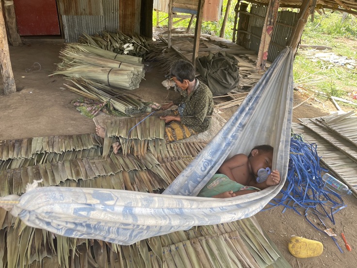 寝ている赤ちゃんの横で、おばあちゃんがバナナの皮で屋根葺を一枚一枚編んでいました。