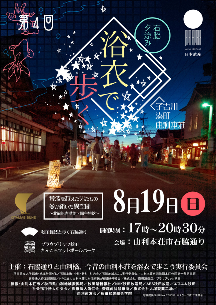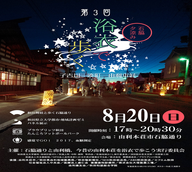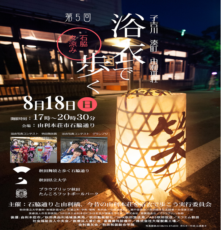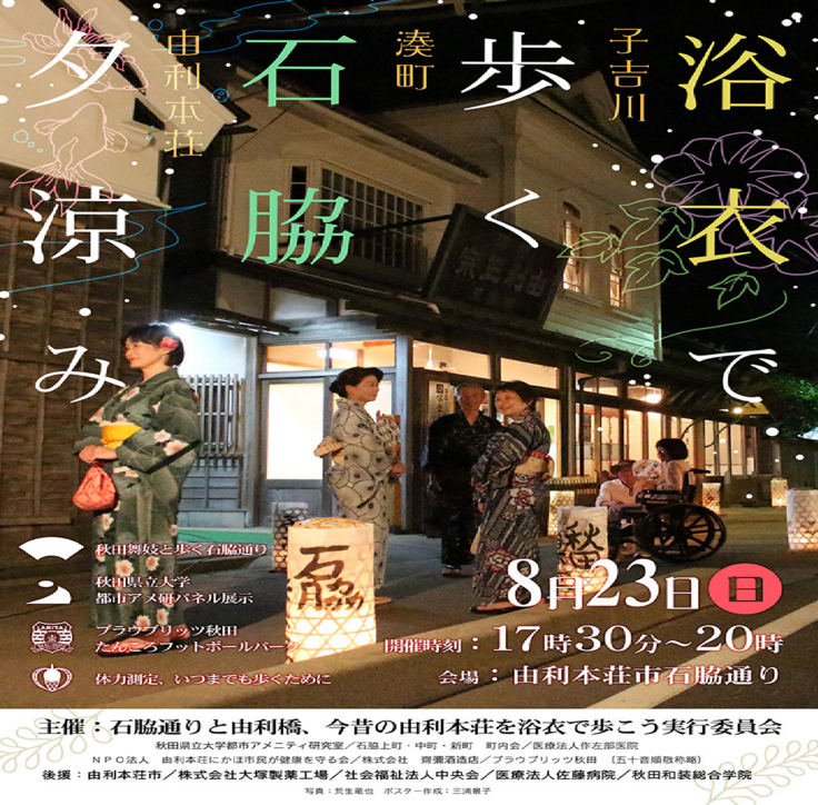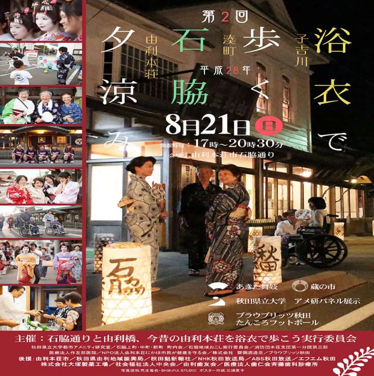 「石脇通りと由利橋、今昔の由利本荘を浴衣で歩こう!」は石脇通りと由利橋をライトアップ、歩行者天国とし浴衣で歩いてもらうというイベントです。由利本荘市の素晴らしさの再発見や歩くことの重要性、高齢者や子供達が触れ合う場の提供、石脇通りの商店の活性化、そして秋田県立大学生による石脇通りの取組みを通して由利本荘地区への定着等を目的としております。浴衣コンテスト、ブラウブリッツ秋田による子供向けの企画、子供達による屋台、若者の出会いの場の提供、また介護施設等へ入所している方をお招きして車椅子で石脇どおりを懐かしんで楽しんで頂きます。