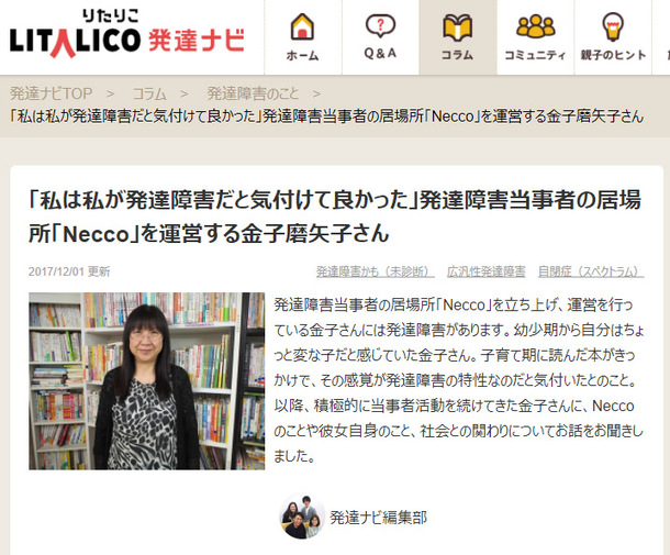 「私は私が発達障害だと気付けて良かった」発達障害当事者の居場所 「Necco」を運営する金子磨矢子さん (詳細リンク先)