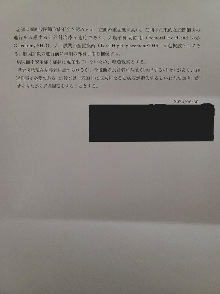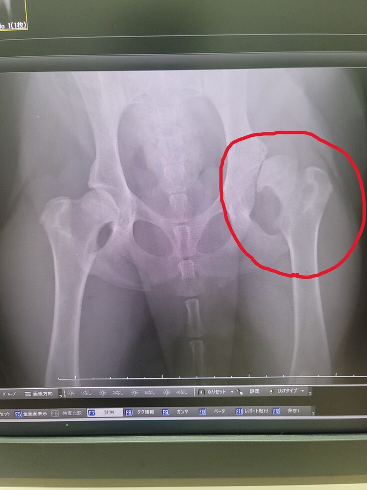 半日検査をしていただいた結果「股関節形成不全」と診断され、大型犬に多くほとんどが先天性の病気との事です。