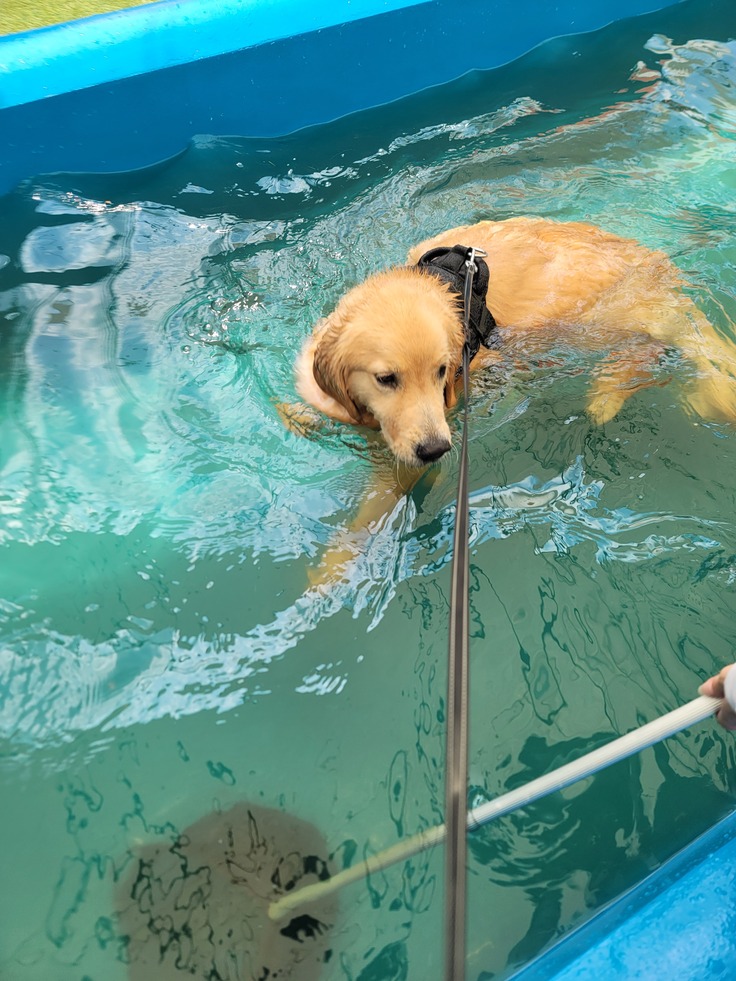 猛暑も続きあまり運動ができていなかった為、本日ドックランのプールに行ってまいりました。お医者様からも後ろ足の筋肉が落ちてしまうことが1番危ないとのことと、プールが筋肉を鍛えられると助言をいただき運動してきました。ドックランに到着し一目散にプールへダイブしとても気持ちよさそうに泳いでいました。まだ年齢が若いためプールから出ですぐに走ってほかのワンちゃんと遊ぼうとするのですが、やはり左後ろ足を少し引きずりながら歩いている光景があり、少し切ない気持ちになってしまいました。元気に走れるようになったらいっぱい遊ばせたいです!