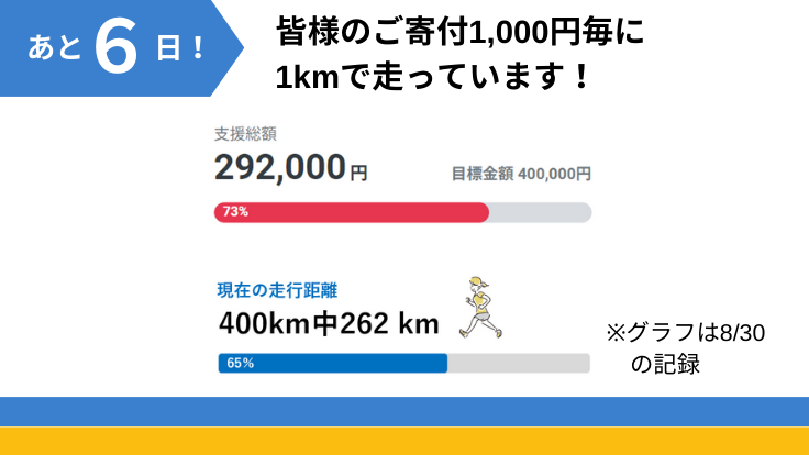 40万円の目標のために皆で400キロ走るという計画は、張り切りすぎた僕の股関節の故障で遅れがちですが、故障も治ってきたので、挽回します。この先は月に150キロ走ることを目指します。