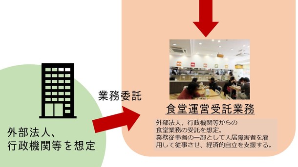 現在、外部法人・行政機関が外部委託している食堂運営業務を受託し、その業務の中でグループホームの入居者を自社雇用していきたいと考えております。実際にらぽーるでの生活面での支援に加えて、社会的に適応していくためのトレーニングもここで障害者の方々は積むことができます。
