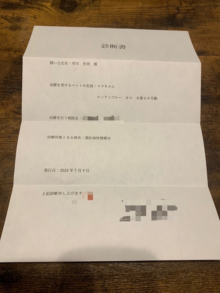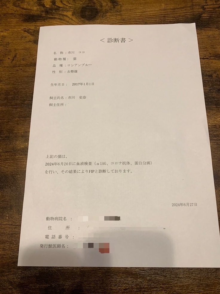 この時、先生からは【FIP(猫伝染性腹膜炎)】の恐れがあると告げられました。