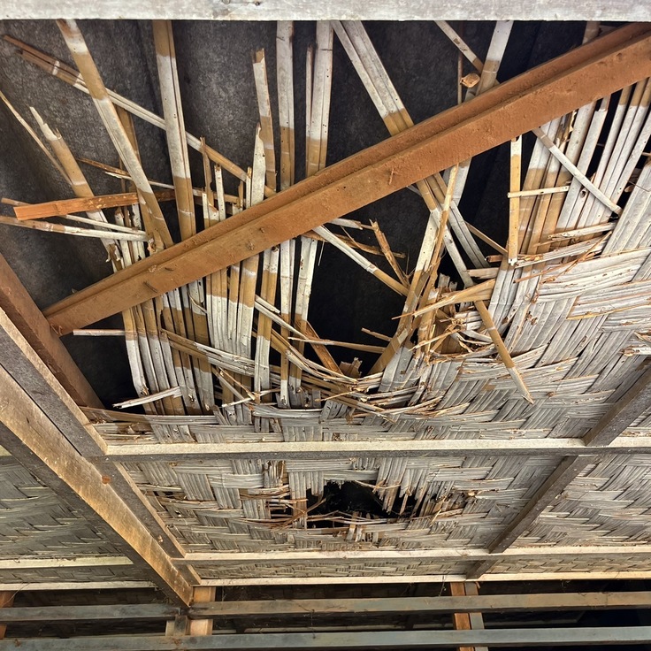 現在ノーンメーク小学校では雨季の豪雨や暴風の影響から深刻な校舎の破損、老朽化が進んでおり、ラオスの農村部にある数多くの小学校の中でも特に壁や校舎内の設備の欠損が目立っています。また、これ以外にも経済的支援を必要とする様々な問題を抱えています。校舎は全て木造で政府と村人たちが時間をかけて建設しました。屋根には竹が使われており約20年間作り替えられていないため、激しい老朽化が見受けられ、いつ崩れ落ちてもおかしくない状況です。教室の壁はもともと柵状の作りでしたが、激しい雨風から子どもたちを守るため近年村人たちによって横板が貼られました。しかし、電気が通っていないため教室が暗くなってしまう、風が通りにくいため夏場が蒸し暑いなど様々なデメリットがあります。下の3枚の写真は現在のノーンメーク小学校の様子です。