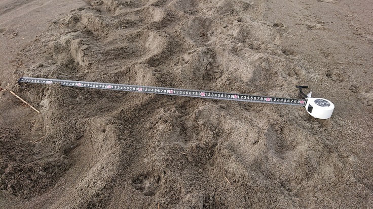 足跡痕の幅が第一号より若干狭く(90㎝弱)、形状も少し異なりましたので、別の個体のようでした。近いうちに産卵リベンジが期待できそうです。