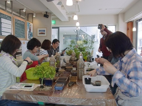 (手のひら盆栽授業。先生は趣味が盆栽の理容師さん。)
