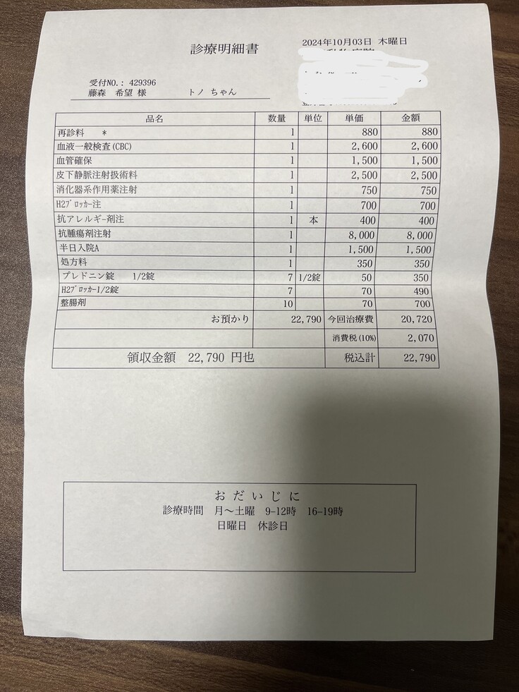 先日3日木曜日に再度抗がん剤を投与して参りました。