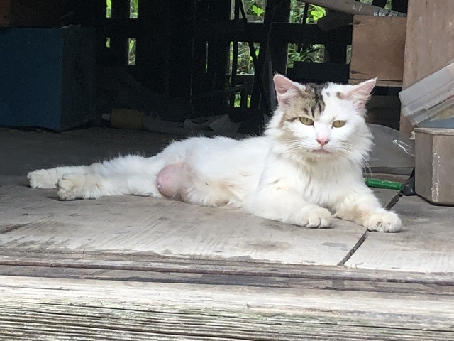 チョウさんは我が家で見かけた時点ではとても小柄な長毛の白い猫でした。