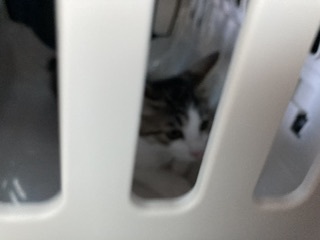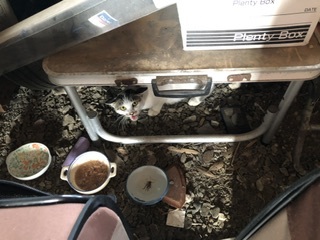 出産した姉猫は相変わらずの警戒心の高さです。いつでも壁の奥に逃げられる場所から動きません。皿には毎回虫など入っていて食料は皿に入れる習慣のようです。一時保護したときにお皿で食べる習慣が変に身についたのでしょう。