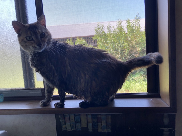 本日は我が家の飼い猫を1頭洗いました。↓ドライヤーから逃げるトンボ。この猫は毛づくろいが苦手です。