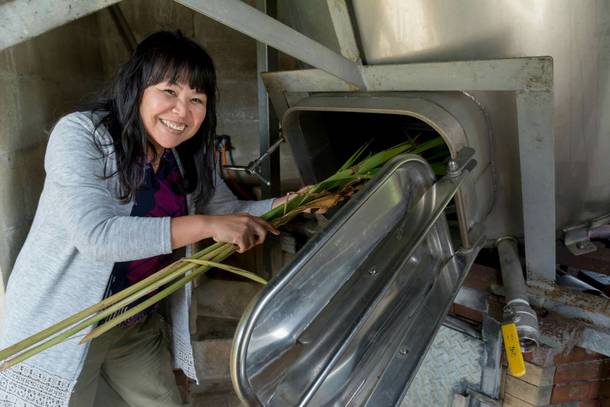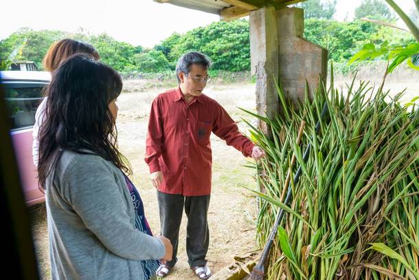 さとうきび畑から持って来た月桃の葉を集めて、精油が出来るまでを