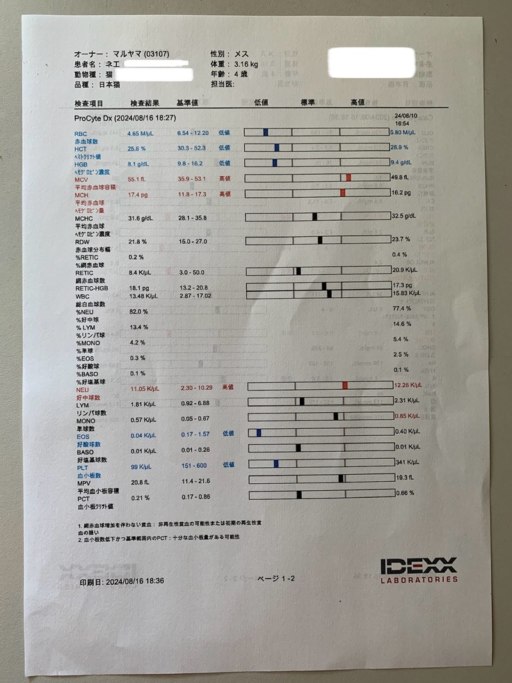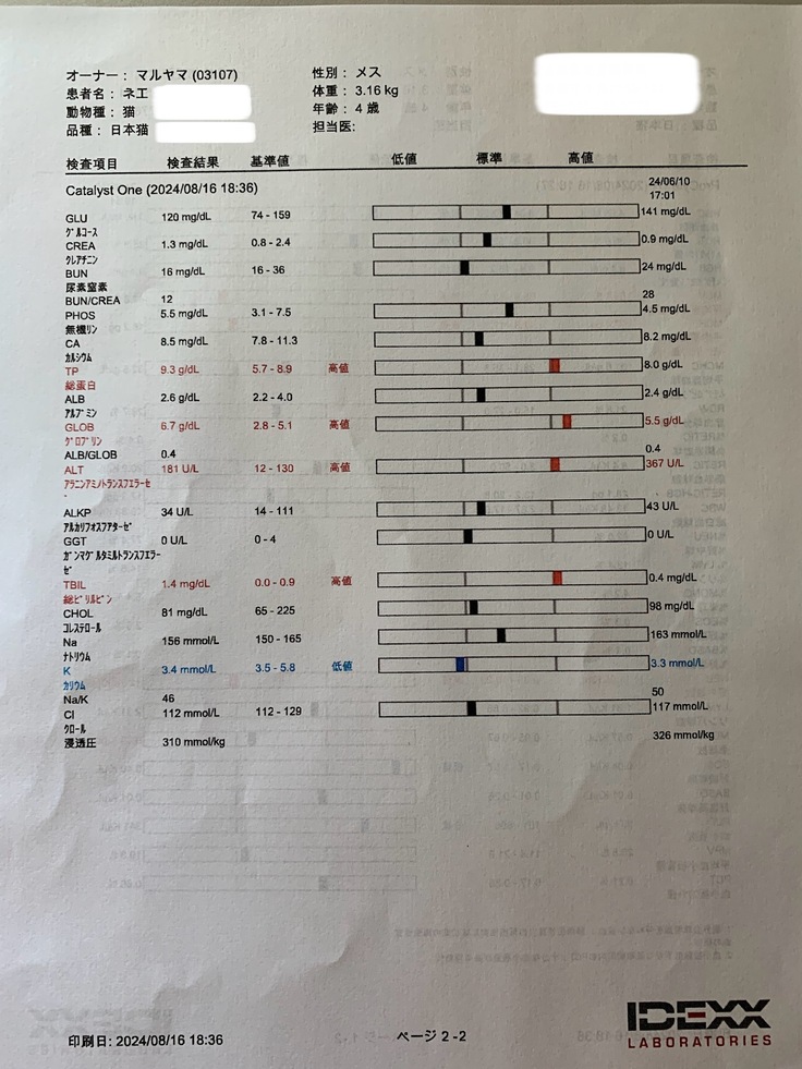 症状は回復傾向にあるものの完治には至っておらず継続して治療薬の投与を行うよう担当医から指示をいただきました。外部検査の詳しい結果が出るまで1週間程度を要します。病院で分かる検査結果は以下の通りで猫伝染性腹膜炎の寛解には至ってない可能性が高い理由などの説明を受けました。
