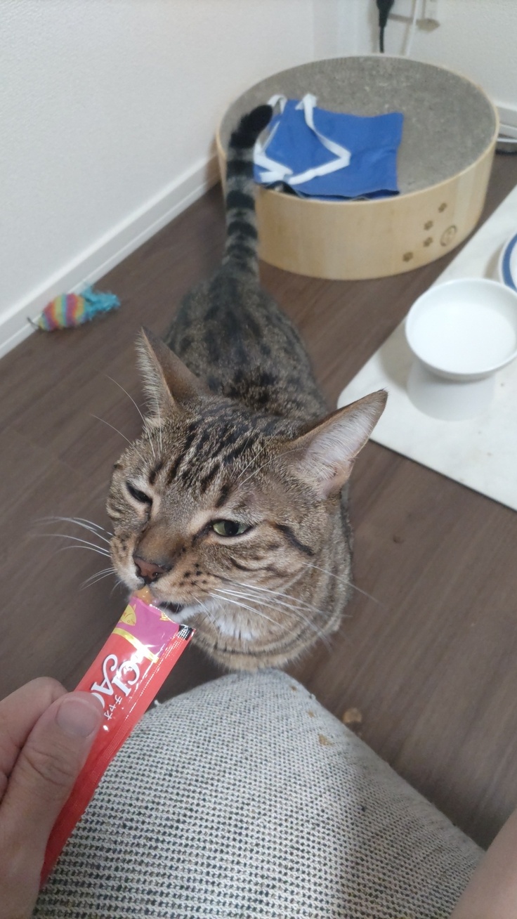 高カロリーのエナジーチュールをあげてますが、今日は切らしてるので普通のチュールあげました!