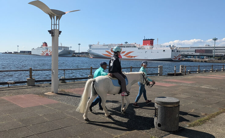 遠くまで広がる海を見ながら、馬の背に揺られての散歩をおおいに楽しんでもらえたようで、みんな笑顔で記念写真を撮っていました。