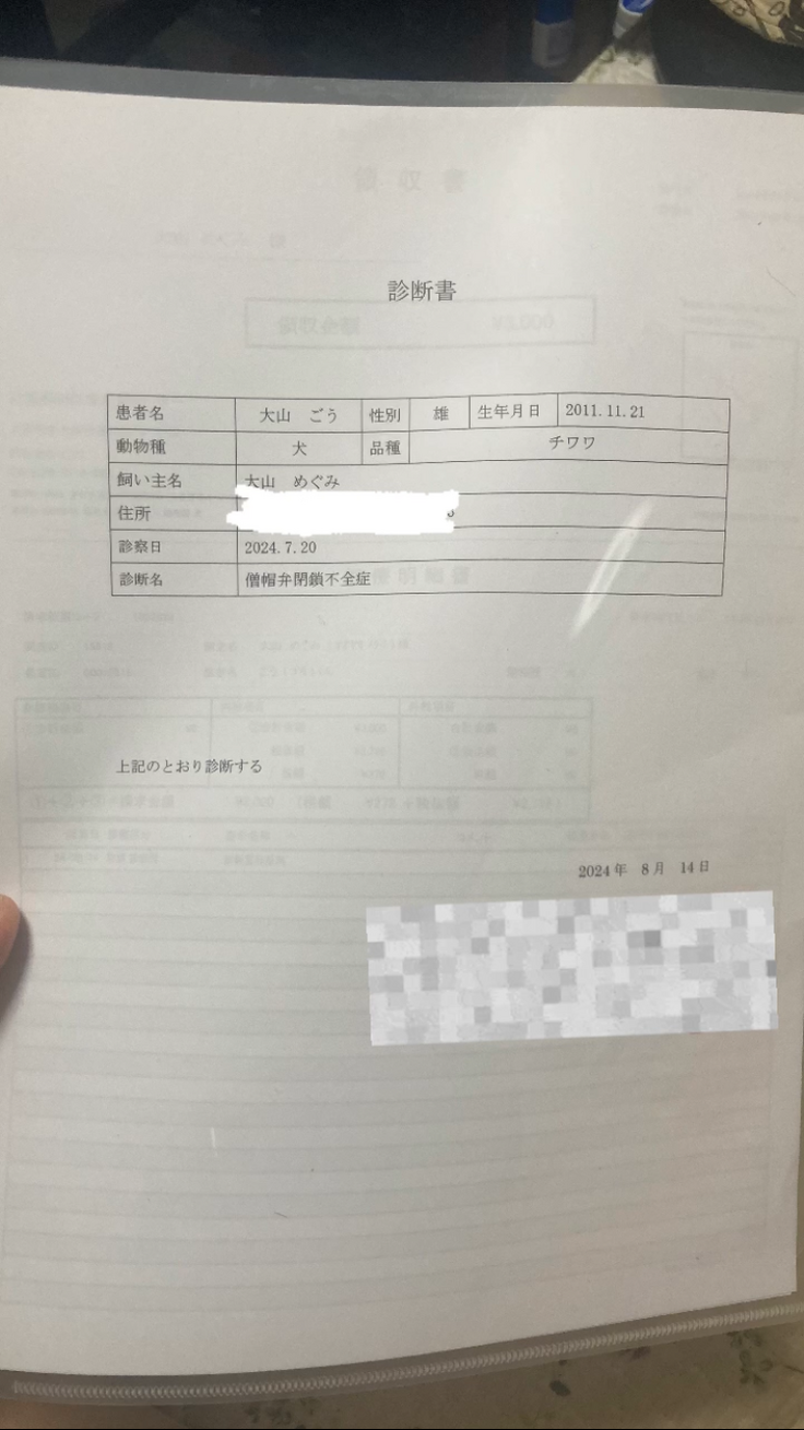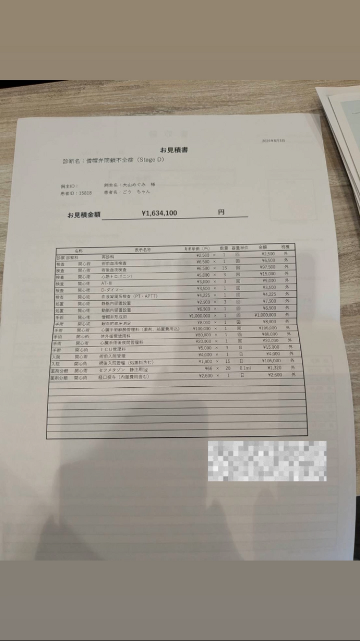 僧帽弁閉鎖不全症の手術と入院費用に当てさせていただきます。費用を全て合算すると160万を超えます。