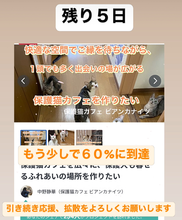 残り42%、集まることを願って、諦めず頑張っていきたいと思いますので、応援、拡散をよろしくお願いします。