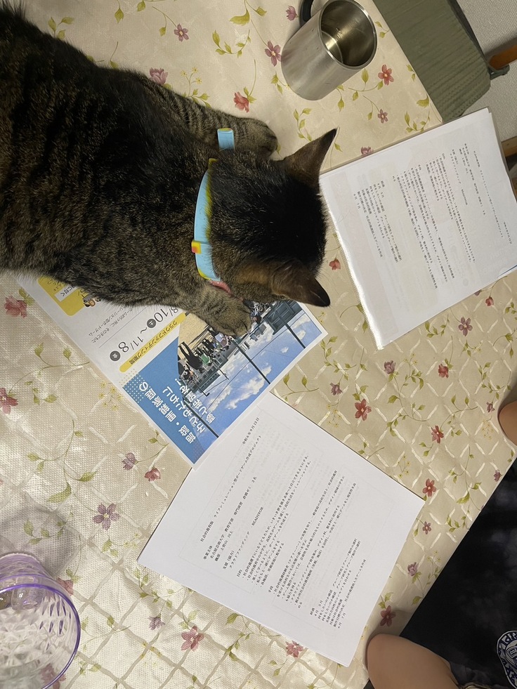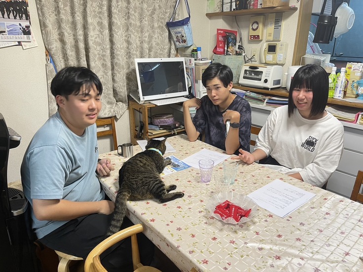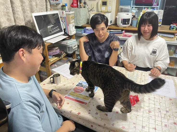 進捗状況の確認を行いました あわせて倉橋先生宅のファミリーホームも見学しました。倉橋家のネコ、トトちゃんもミーティングに参加しました。トトちゃんも興味を引いてくれるような活動になりました!少しずつポードができてきました!(ゼミ生全員初めての顔出し!)