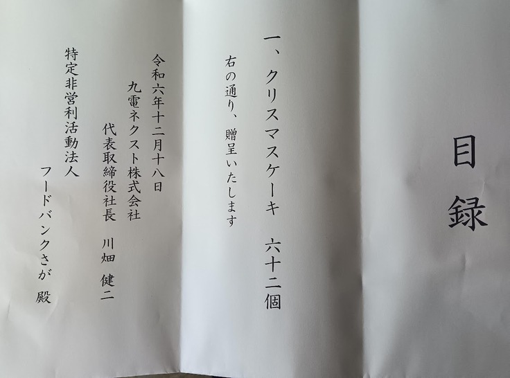 九州電力ネクスト様よりクリスマスケーキ62個いただきました。ありがとうございました。