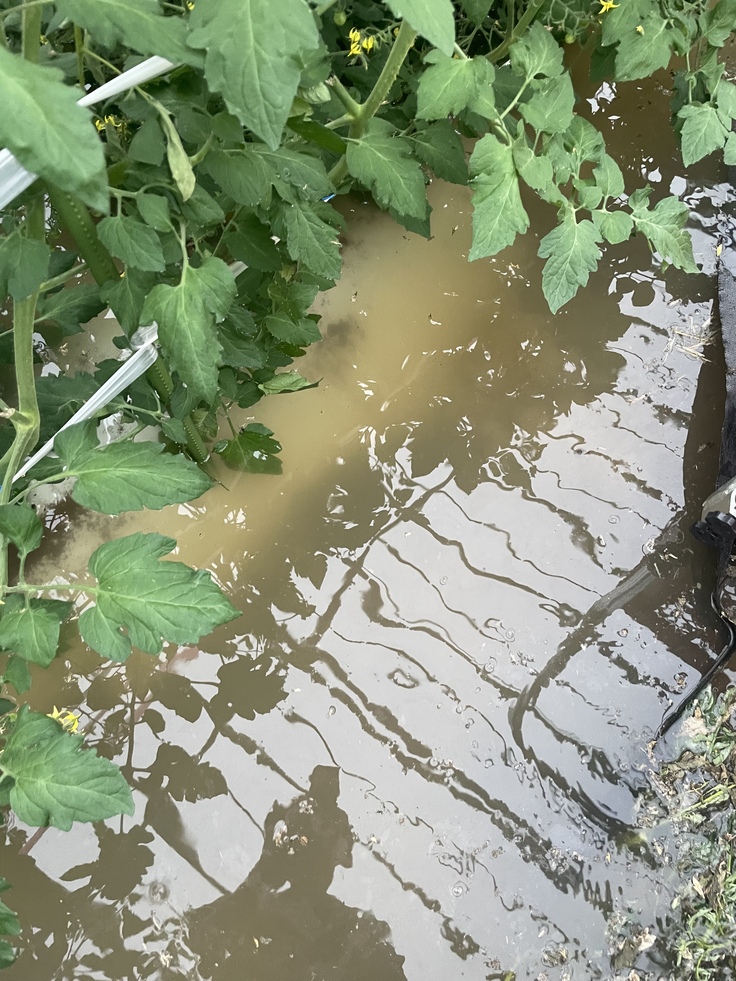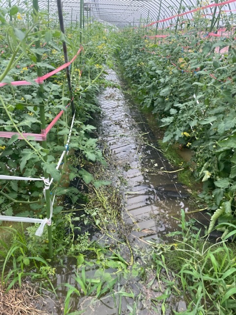 令和6年7月25日に山形県を襲った、豪雨災害によりミニトマトハウス等が浸水してしまい、1棟全てのミニトマトが枯れてしまいました。また雷によりポンプ等の設備も故障をうけました。