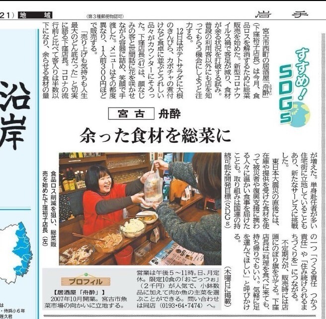 コロナ禍で、いろいろ挑戦していく中で、食品ロスと常連客の安否確認が目的で、お惣菜を始めたところ、地元紙「岩手日報」様に取材をしていただきました。