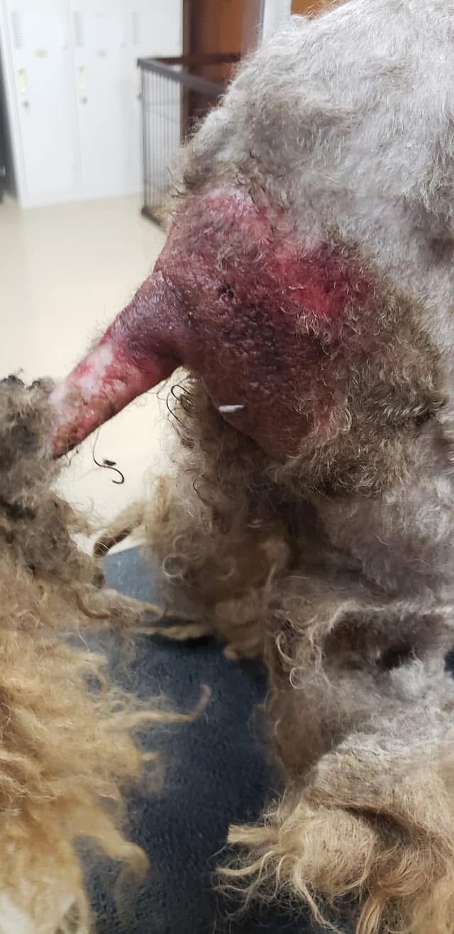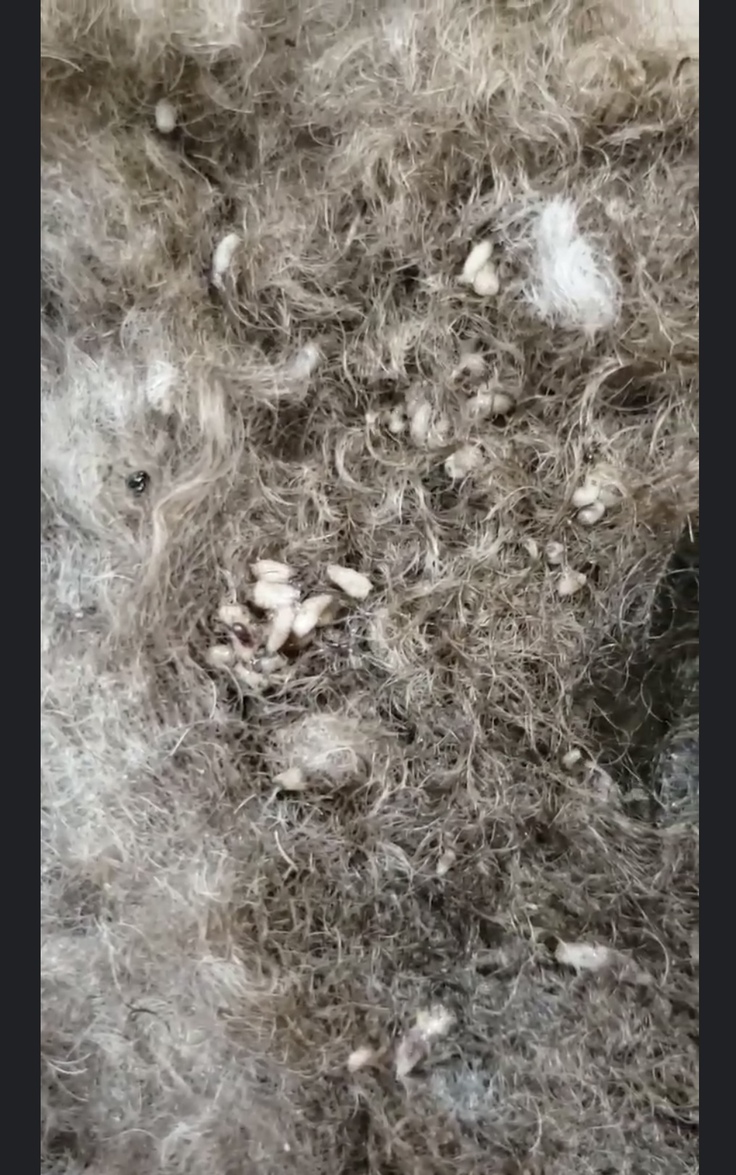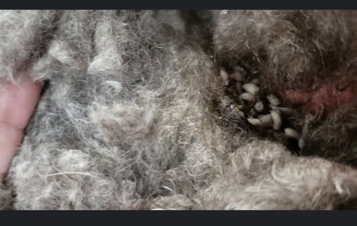 体に絡みついたもつれや毛玉が皮膚を引っ張りとても痛そうで一番最悪だったのは、お尻の方の大きなもつれの中にフンが溜まっており、その中にたくさんのウジ虫がわいており、この子の体を蝕んでいました。