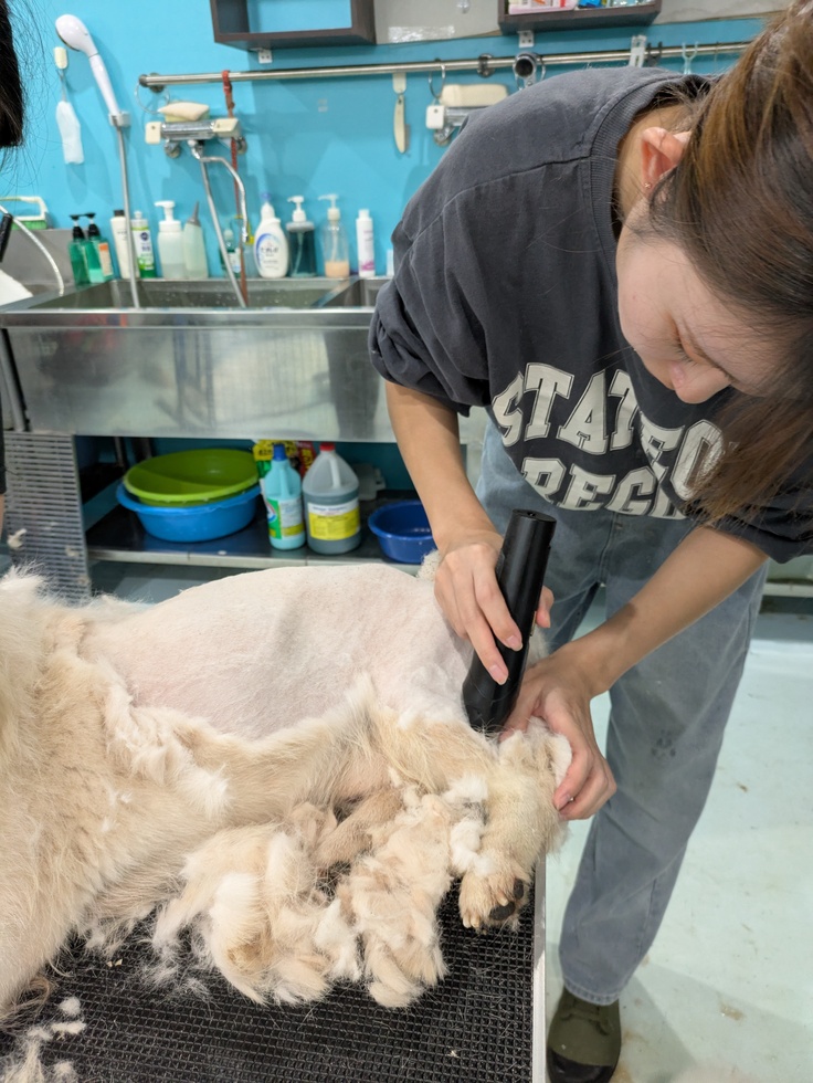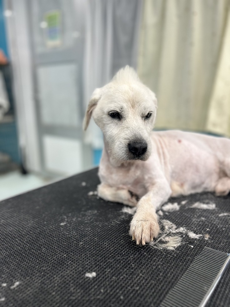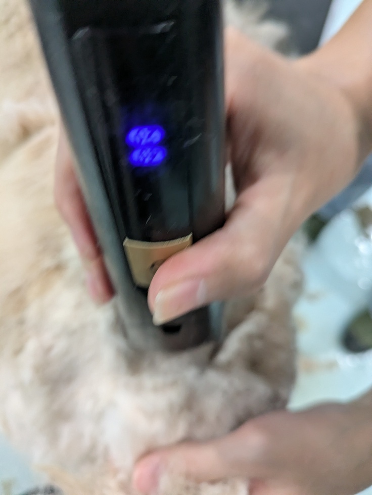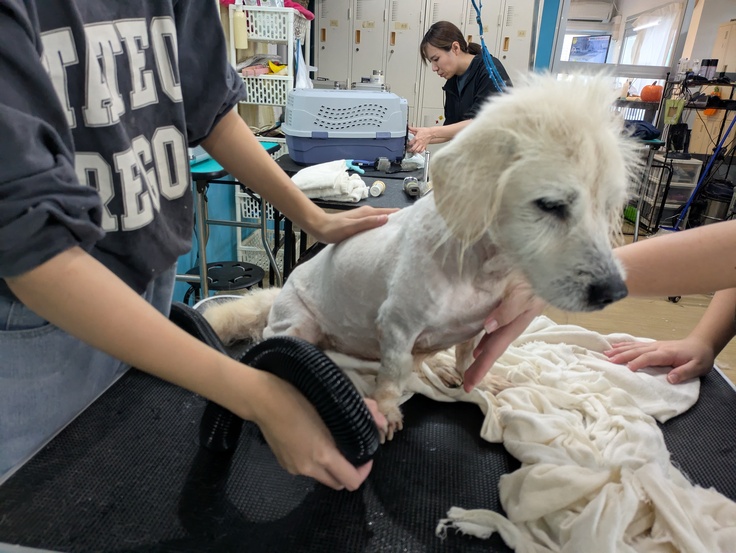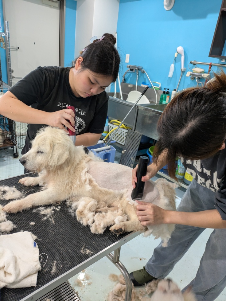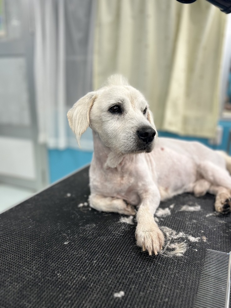 事前に送られた写真では、ふわふわに毛を残せそうな感じだったのですが、実際見たら、バキバキのもつれで可哀想ですがバリカンで丸刈りをしました。3mmの刃が入りにくいくて大分時間がかかりました。