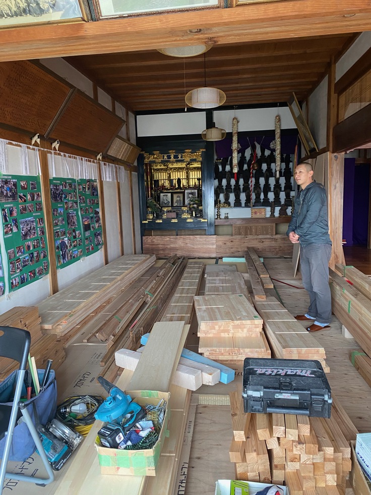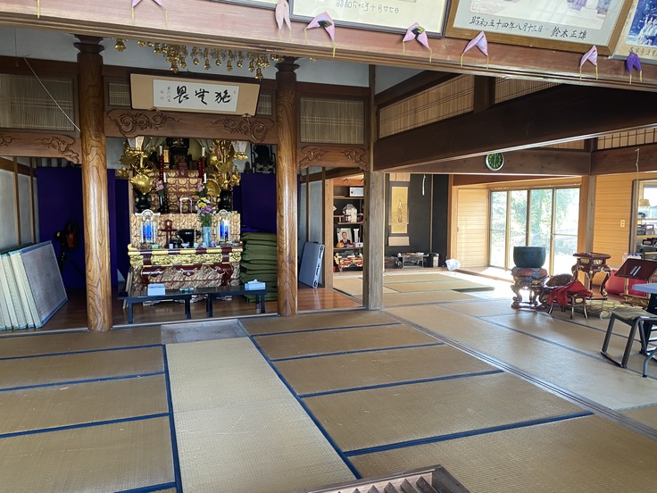 また、畳も入りました!位牌堂の予算がオーバーする見込みのため、畳は滝田一成師の自坊である広際院さんや廃業する旅館などからのありがたい申し出により、使わなくなった畳を寄付していただきました。真新しい畳もいいですが、この畳の上で様々な法要がなされてきたのだなと思うと、かえってありがたいと感じています。寸法は畳屋さんがうまく合わせてくださいました。