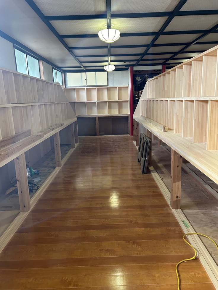 位牌堂の棚も大分組み上がりました。あとは下の袋戸取り付けと塗装作業が残っています。
