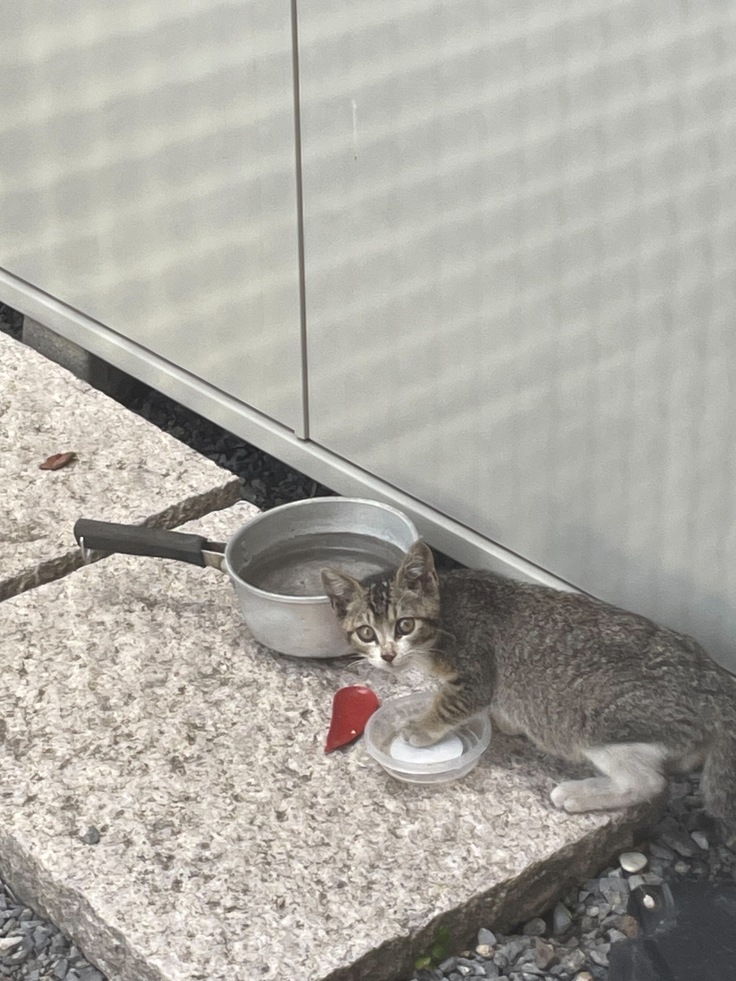 いつもは急いでガツガツとほぼ丸呑みで食べるネコさんですが、母が隣の敷石に座っていても体を半分だけだして、ゆっくりと噛みながら完食したそうです!