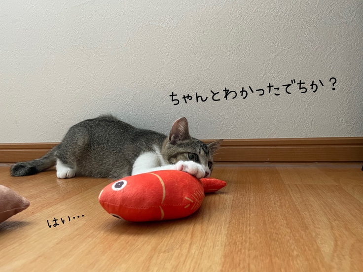 下敷きになり負けて焦ってケージに戻る事を繰り返していたので何かぬいぐるみを…っと