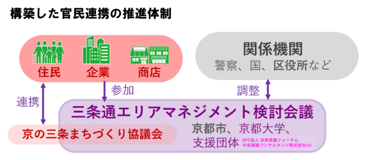ページをご覧いただき、ありがとうございます。私たちは、京都市の都心地区にある三条通(寺町通~新町通)をフィールドに活動する三条通エリアマネジメント検討会議と申します。地域のまちづくり協議会(京の三条まちづくり協議会)を中心に、地域住民、沿道店舗、行政や大学、さらには三条通を愛する有志などで構成する団体です。