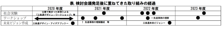 この三条通エリアマネジメント検討会議は、「三条界わい景観整備地区」にも指定される魅力ある三条通について、地域のチカラで、住民、沿道店舗、訪れる人それぞれにとって、より良い空間にしよう、将来のみちづくり・まちづくりを実践しようということで2020年に立ち上がった組織です。検討会議の立ち上げ以降、地域住民等を対象とした複数回のまちカフェ(ワークショップ)とともに、公募で集まったUNDER30(大学生+30歳未満の社会人)の若者による「三条通デザイン・ワークショップ」等を開催し、2021年3月には、それらで得られた目指すみちの姿を「三条通デザイン・アイデアブック2021」として、とりまとめを行い、目指したい将来像を明らかにしてきました。また、その後、将来像を実現するためのアクションプランを定めた「三条通未来ビジョン」を2023年3月に策定しており、目標年次とする2030年に向けて、通りの歩行者空間化と、それを活かすエリアマネジメントの人材育成の加速を図っているところです。