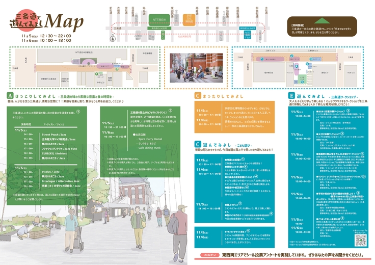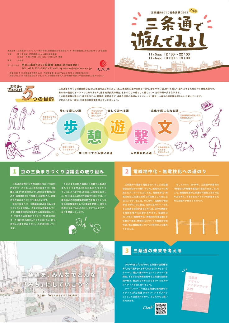 三条通エリアマネジメント検討会議では、2021年以降、毎年秋に交通規制を含む社会実験「三条通で遊んでみよし」を実践してきました。